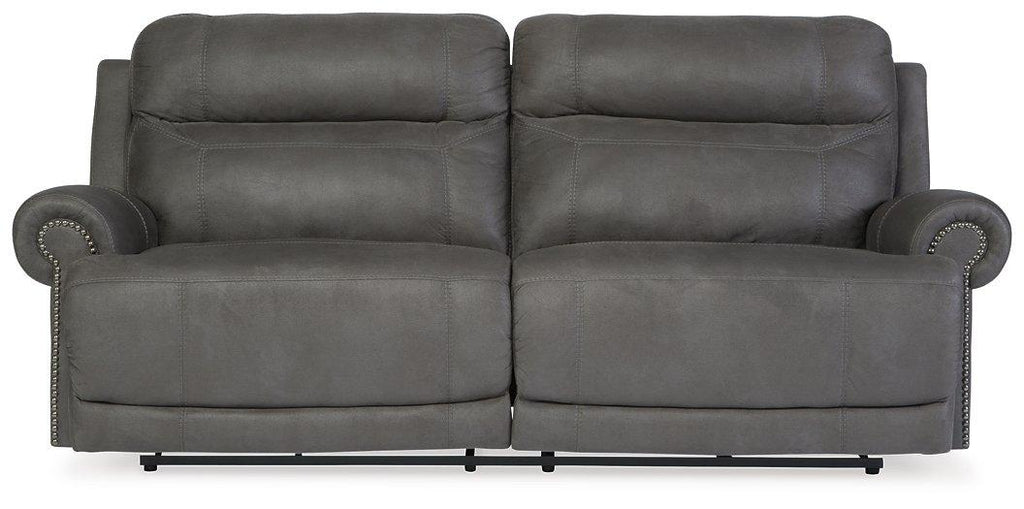Sparing that "puffy" look you might expect from a recliner, this reclining sofa doesn't hold back when it comes to contemporary style. Subtle touches such as sporty jumbo stitching, nailhead trim and a "weather worn" effect on the upholstery give this handsome piece a buttoned-up appeal and fresh feel.