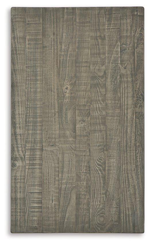 - Tabletop and shelf have weathered gray textured finish