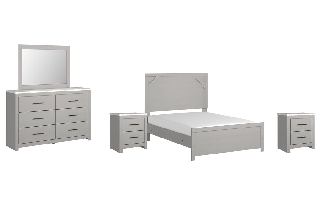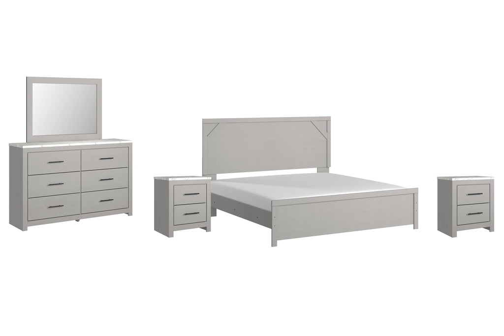 Cool, clean and casually modern. This bedroom set’s wispy dove gray finish sets the tone for your calming sanctuary. Framed elements and cross-brace accents add dimension and authenticity to the bed’s simply stunning profile. The storage pieces' large linear pulls and smooth-gliding drawers neatly accommodate your wardrobe and bedside storage needs.