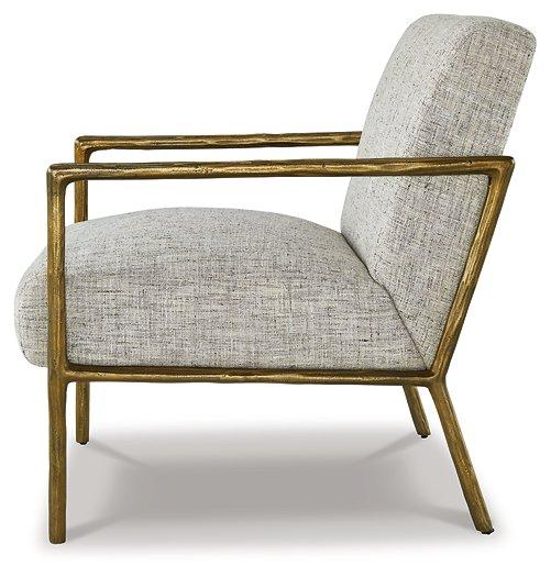 A modern take on classic design, this accent chair provides both flair and function. Richly neutral upholstery gives off a vibe of easy elegance, bringing home high-end style for everyday living. An antiqued brass-tone finish has a rustically luxe look that remains versatile, suiting spaces from casual to contemporary.