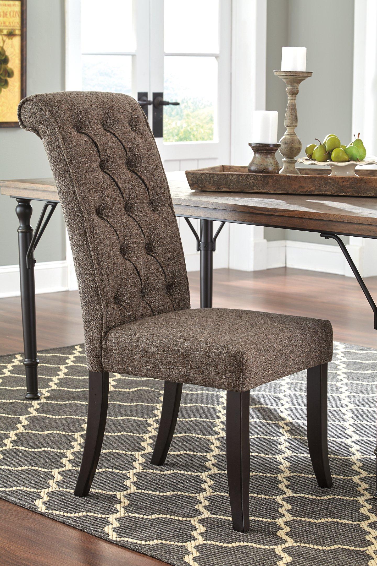 This arrives at the table with the full scale comfort of a favorite living room chair. Classic tufting dresses up the high, beautifully curved back. Both seat and back are firmly cushioned and covered in a textured upholstery.
