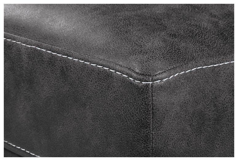 This ultra-contemporary chair and ottoman set invites you to kick out and make yourself comfortable. Linear track arms offer a clean, sleek aesthetic, while tufted box cushions are a nod to mid-century design. Gunmetal gray faux leather offers the cool, weathered look you love and touchably soft feel you crave.